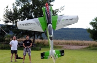Používal jsem Zippy Compact, ale nejsou nic moc. Každý článek je trochu jiný. Letovým časem si teď nejsem jistý, jistě bude záviset na letovém stylu. Ale stopky mám asi na 6 minut. Odběr s vrtulí 32x12 je 220A, možná trochu víc s tvrdší baterkou. Lepší letový projev asi bude s 30x13, kterou lítají kolegové i na benzínových motorech.