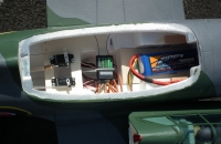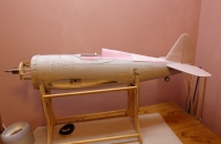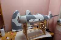 V loňském roce jsem si pořídil kit P 47 Thunderbolt od FMS za super cenu, osadil jej a vyrazil k nám na letiště v Suché. Po opravě těžiště, které je v návodu uvedené blbě, lítal model skvěle, v sestavě motor EMP 4240/890kV, vrtule 13x7 a čtyřčlánek 3000mAh jako skutečná stíhačka až do doby, kdy přetěžovaný motor nevydržel a shořel, spálil se samozřejmě i regulátor, bezproblémové přistání do trávy bylo jen kvůli externímu BECu... V Suché jsme byli se stejnými modely tři a navíc majitel letiště, Pavel Štern, měl dvoumetrovou P 47 ve stejné kamufláži. Nehoda mi tak přišla vhod :-). Z extrudovaného polystyrenu jsem přidělal hrb a vzniknul tenhle razorback v RAF kamufláži. Při přestavbě jsem úplně vyřezal celé původní uchycení motoru a udělal ho nové z překližky a smrkových lišt. Nový, pomalejší motor s baterie mají tak i víc vzduchu, který se odvádí novými maketovými výdechy vzadu na trupu. Původnímu modelu totiž jakýkoli výdech teplého vzduchu chybí!! Plánovaný zálet se dnes bohužel nekonal, povedlo se vytáhnout z křídla prodlužovací kablík k servu křidélka, a to se neobejde bez zásahu do křídla. Tak alespoň pár fotek ...