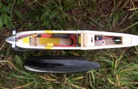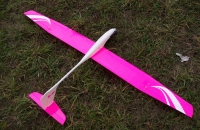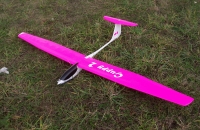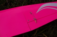Proti svym zvyklostem jsem se tentokrat drzel planku a nevymyslel zadna vylepseni, takze je to prakticky seriovy Guppy. Klapky a kormidla jsou konstrucni s pevnym potahem a ne plna balza. Trup neni potazeny folii, ale natreny dvema vrtvami jasne bileho Alkytonu (malinko naredeny). Potah je Oracover ruzova neon fluo, stejne jako oranzova fluo je i tahle paradne videt. Kabinka je durofol, drzi na suchace, striknuta barvou na lexan.