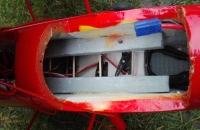 Výškovka je ovládána bovdenem, pro směrovku jsem udělal vahadlo a přenos síly je silonem.Ovládací páky všech kormidel jsem vyřízl z plastové desky a vlepil do ovládaných ploch. Všechna serva jsou vlepena do přesně vyříznutých otvorů v polystyrenu.