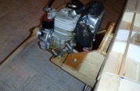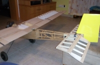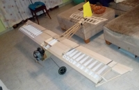 Je to můj první model na benzínový motor. Konstrukce je obšlehnuta od známého o mírně upravená pro motor. Zatím to stavím cca rok. Bojím se pevnosti a nemám na to moc času. Motor je použit z křovinořezu neznámého obsahu asi 20-40 ccm. Doufám že to poletí až to dodelám.