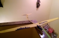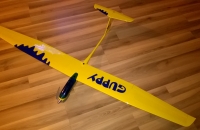 Postaveno podle plánku Mitji Seršena ve verzi s křidélky.Potřeboval jsem někde udat motor, který mi ležel ve skříni a tahle předloha se pro něj akorát hodila. Možná bych přístě trochu pozměnil konstrukci křídla a více ji zpevnil proti krutu. Kabina vylisována z pet láhve od Magnezie na pozitivním kopytě horkovzduškou. Zatím čeká na zálet.