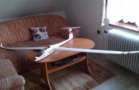 Náhodou jsem na modelbazaru narazil na tento model větroně. Byla to nová nerozbalená stavebnice z číny, ale za rozumný peníz, tak jsem si řekl že to zkusím. když jsem krabici otevřel byl jsem nadšen, ale jen do doby než jsem začal model skládat dohromady. Teť už vím proč ten "rozumnej peníz". Nic nepasovalo tak jak by mělo, většinu konstrukčních věcí jsem musel předělat, nebo udělat úplně jinak. Když už jsem byl v tom předělávání napadlo mně dát mu zatahovací podvozek( originál stavebnice ho nemá). Pár dní brouzdání po netu, koukání na foto/video a rozhodl jsem se udělat si celý podvozek sám ( na míru). Podvozek se snad povedl a bezproblémů funguje, problém je, že větroň s ním na trávě rád "zakopává". Takže na trávu sedám zásadně na "břicho". Nakonec se po troše přemlouvání větroň naučil i létat. Létat musí pořád na rychlosti, jak ztratí rychlost jde do vývrtky a to i při přistávání. Křidélka jsem namixoval se směrovkou a zvlášť na mixu mám klapky( křidélka+ výškovka dolu). Let se sice zpomalí, ale zároveň se otupí ovládání křidélek, což je v malé rychlosti a při přistání trochu problém. Člověk se s ním musí trochu naučit, ale za to, jak nádherně vypadá za letu ( hlavně bez motoru) to určitě stojí...